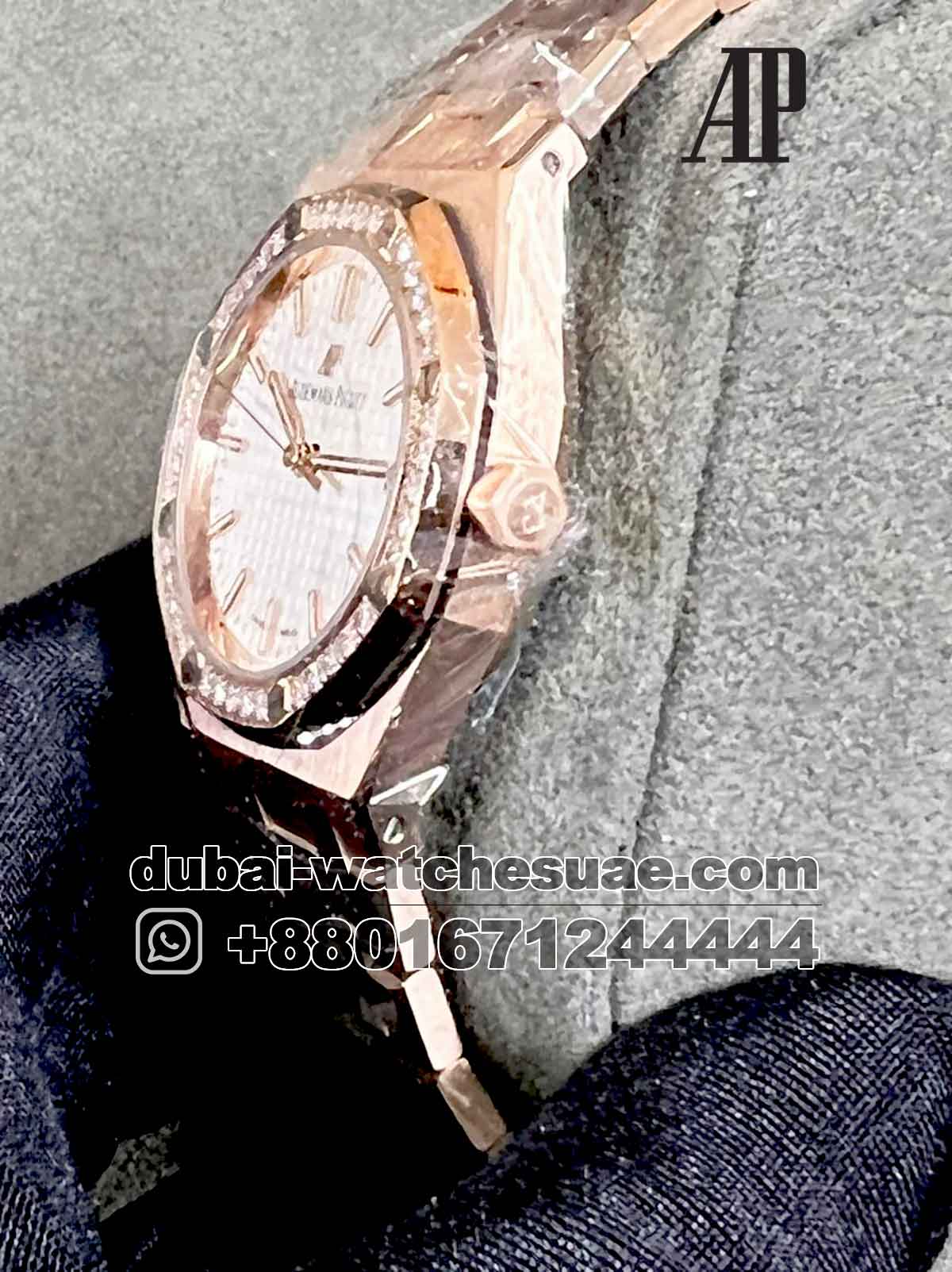 The new Audemars Piguet Royal Oak 34 mm is one of the most elegant watch in AP family.The? white and gold combination puts some grace on it and creates the more detailed look.The? screwed bezel? with stone work and 18 k gold plated bracelet can hold your wrist with classy look.