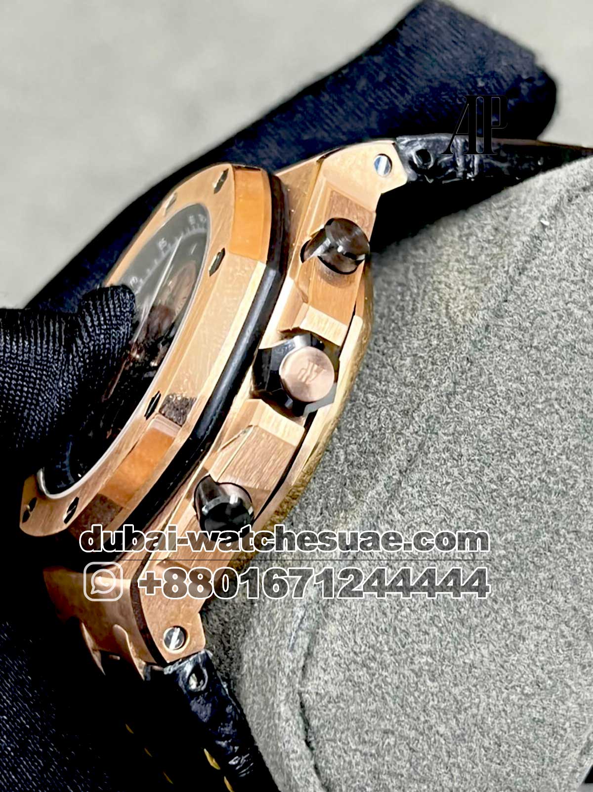Audemars Piguet Royal Oak Offshore Chronograph 42mm Rose Gold black. The new Audemars Piguet Royal Oak Offshore Chronograph 42mm Rose Gold is one of the most elegant watch in AP family.The combination of rose gold and black colors on both dial and sub dials puts some grace on it.The screwed bezel and leather stripes can hold your wrist with classy look.So, just don’t dream it , make it happen.
