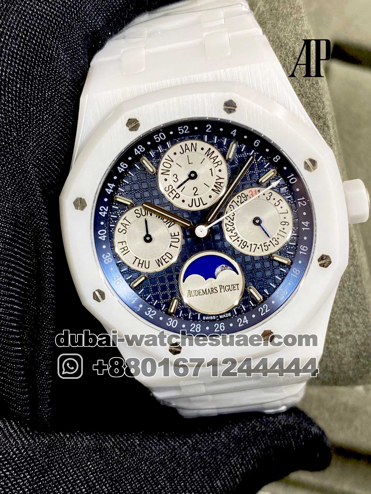 This watch has attitude to spare .Crafted in hand-finished white ceramic, this?Royal Oak Perpetual Calendar features day, date, month, astronomical moon, and week of the year. Perpetual Calendar 14 Keep the time perfectly .The thing that make it stand alone exclusive variation apart is its white ceramic case and bracelet, paired with a beautiful blue dial.? Its been one of the hardest Audemars Piguet watches to get out of the whole collection of AP. Go unique with this exclusive piece of your choice.