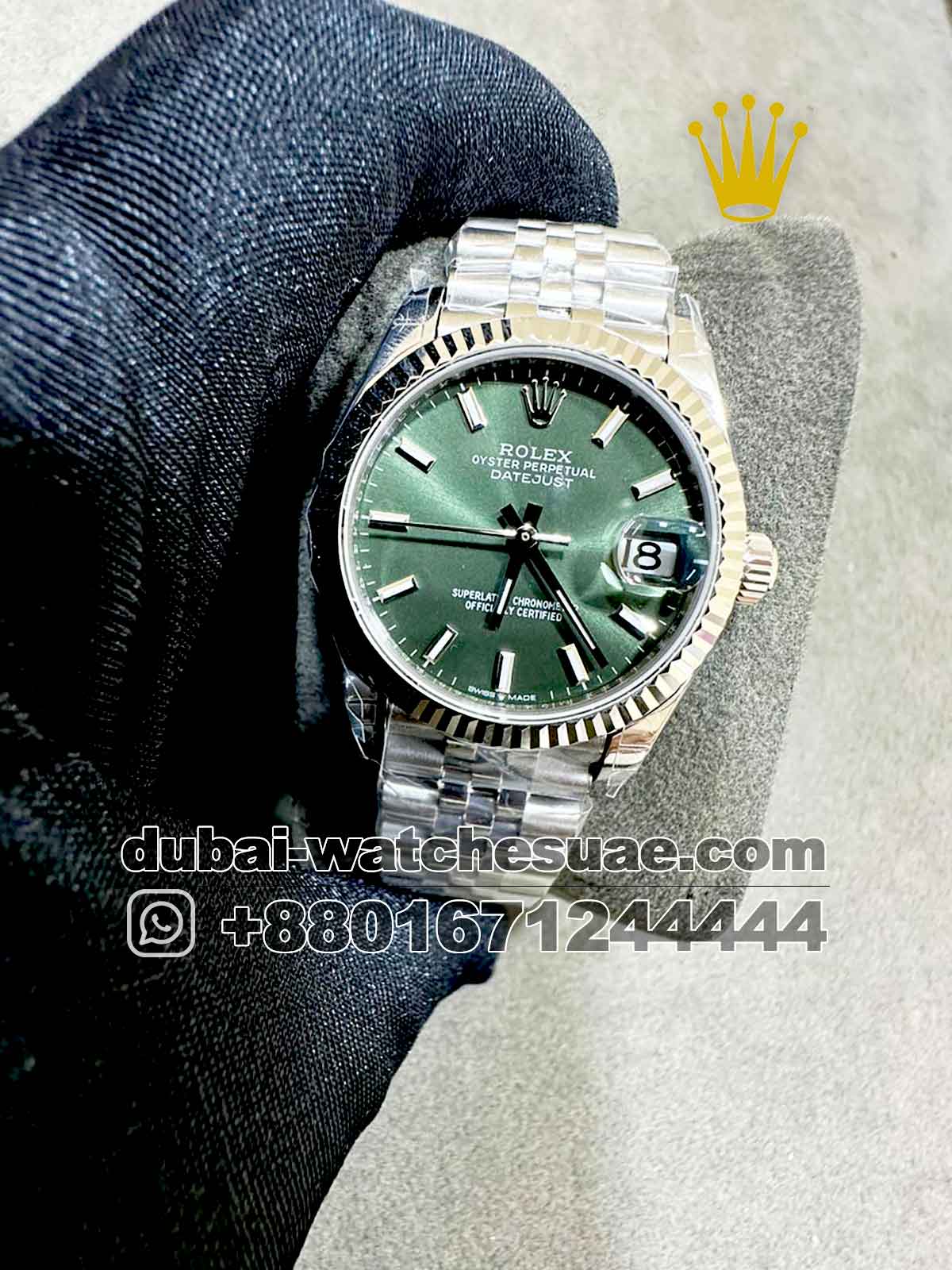 The Ladies Rolex 31mm Datejust Olive Green Dial Replica is powered by a Swiss-made automatic movement. It ensures dependable and accurate timing without any battery. It has a stylish, rich-looking olive green dial that is appropriate for both casual wear and formal events. The premium 904L stainless steel used to create the fluted bezel offers superior durability and a high-end finish. The jubilee bracelet crafted from 904L stainless steel that confirm comfortable fit and an elegant finish. This replica has waterproof features for daily use.