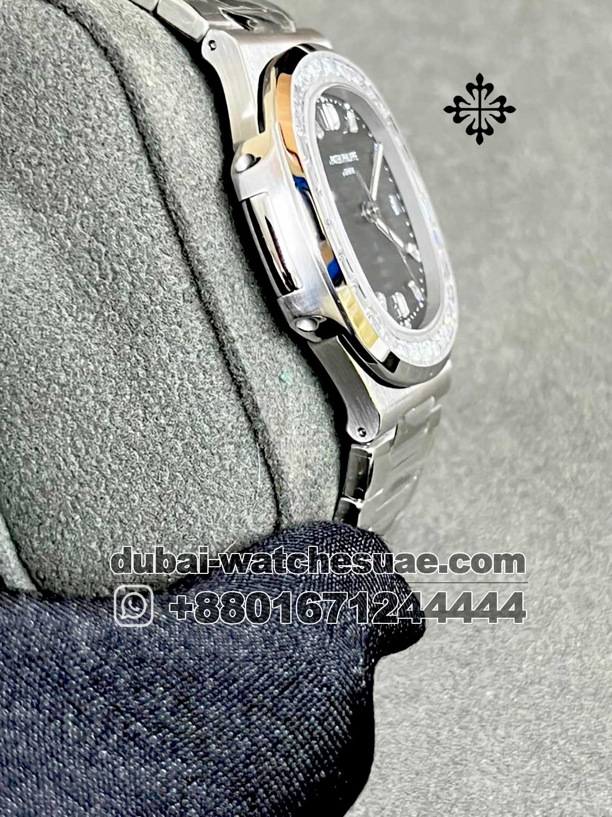 The unique octagonal bezel of this master copy is highlighted with carefully placed stones to create a brilliant frame that immediately improves its overall look. The bezel shimmers perfectly with every movement of your wrist due to the careful placement of each stone. The bold, unique identity of the Nautilus design is preserved while a hint of luxury is added by this careful finishing. The result is a sophisticated and eye-catching appearance that draws attention from every aspect and improves the watch’s overall elegance.