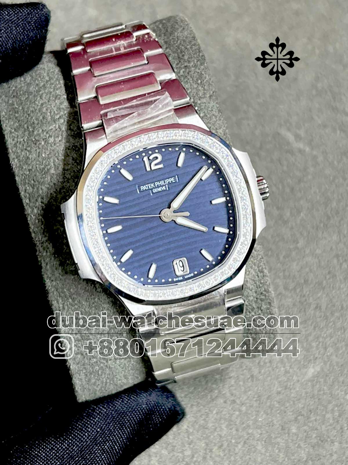 PATEK PHILIPPE Nautilus Ladies Automatic Reference #7118/1200A-011 is known for it?s elegant appearance with its rounded smooth octagonal shaped bezel and? blue dial with stone work . The steel bracelet can hold the grace on your wrist .