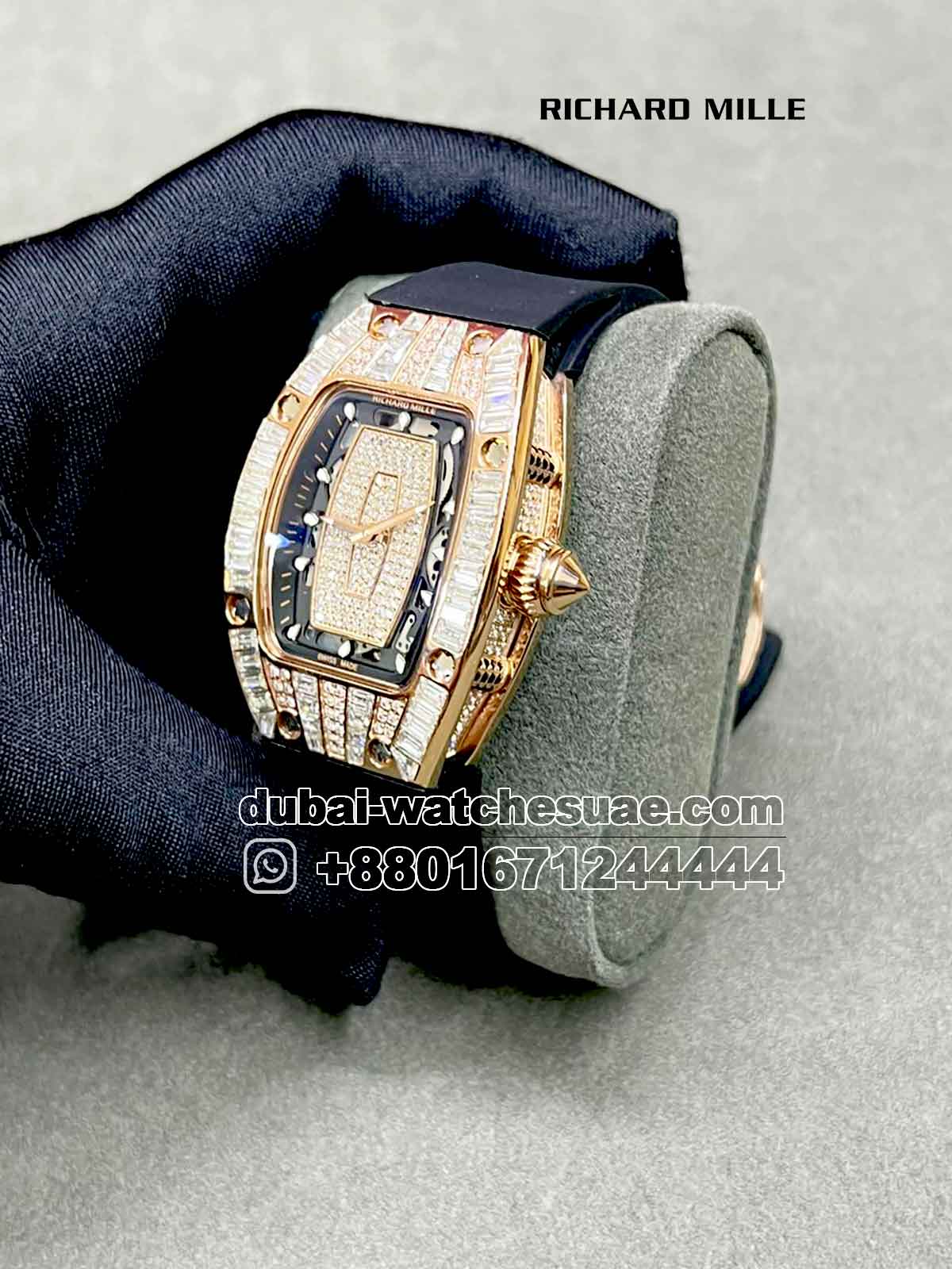 This replica watch is built with high-quality materials and a Swiss-made machine to assure superb performance. The white dial is finely highlighted with stonework and a golden outline for a sophisticated, luxurious appearance. It features with automatic movement that provides smooth and reliable performance. The watch stands out with a touch of luxurious sparkle due to its carefully crafted crystal-plated bezel. A strong black rubber strap that provides excellent comfort and long-term durability makes up the design.  This master copy watch, which comes with a 2-year machine service warranty, combines quality craftsmanship with modern design, making it an exceptional option for both special events and daily wear.
