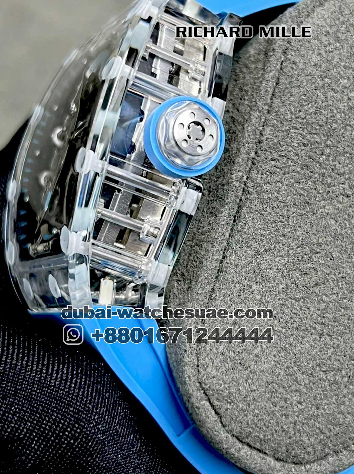 Richard Mille RM 53-02 Tourbillon Sapphire is one of the artistic model of RM family. Crystal? sapphire? case contrast with? ice blue straps with a rubber Titanium baseplates and titanium screws are used. This? exclusive model of RM will give a extra elegant? look to your wrist.