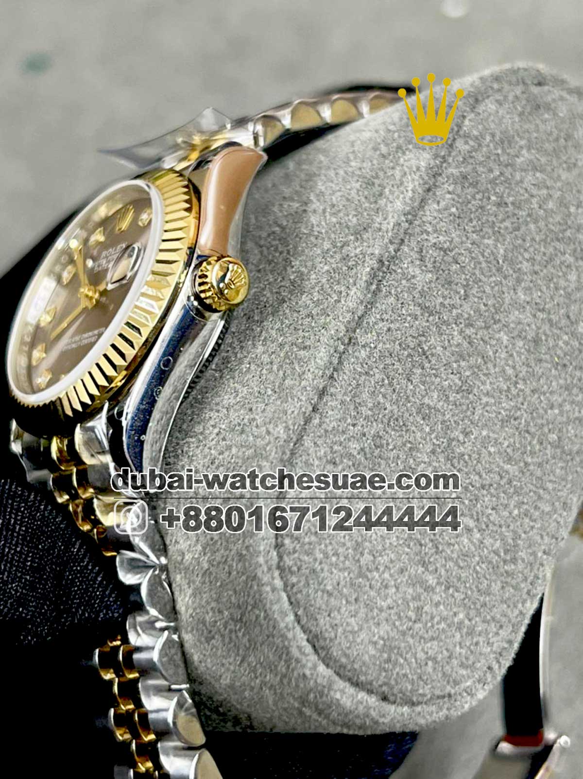 Model: Rolex 31 mm date just two tone Green gold ,Stonework, Roman number,golden flutted bezel