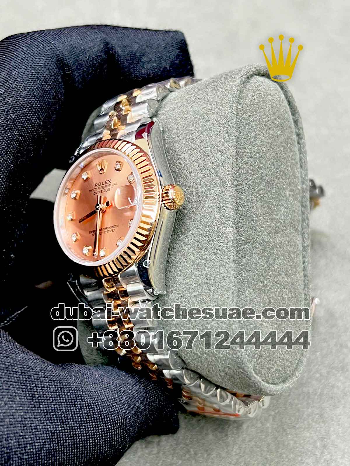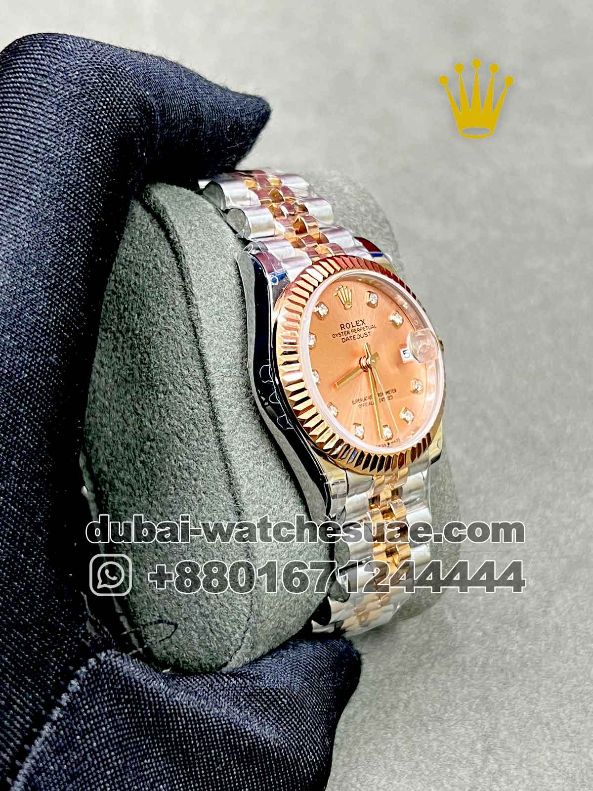 The design of this Rolex 31 mm Two-Tone Rose Gold Dial Replica Watch values fine manufacturing and durable performance. It features with Swiss-made automatic mechanism that provides precise and dependable timekeeping. The rose gold-toned dial is enhanced with stunning zircon stonework, lending an expensive visual appeal. The dial is surrounded by an attractive fluted bezel that has been plated in 18k gold, giving the design depth and iconic characteristics. The bracelet has a balanced two-tone design that combines 18k gold-plated components with superior 904L stainless steel for stability and luxury. The watch is waterproof and suited for daily use, making it ideal for busy lifestyles. Every purchase comes with a 2-year machine servicing warranty, offering assurance and peace of mind.