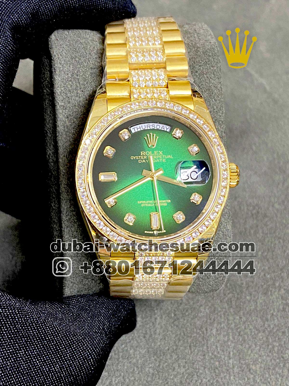 Model: Rolex 36 mm date just Iced out Green face , Stone work bezel with iced bracelet