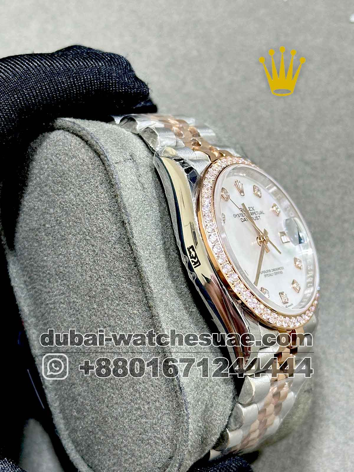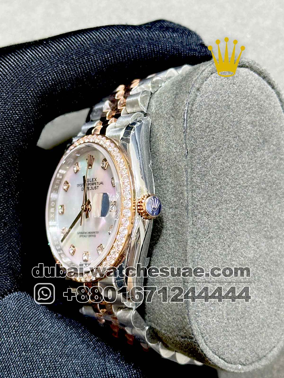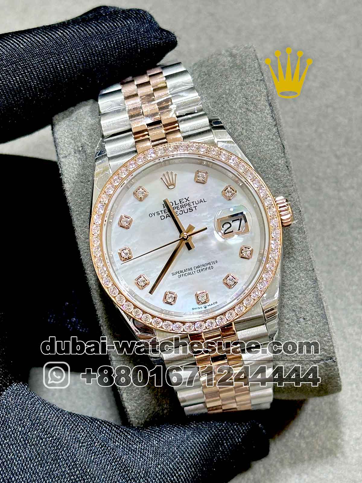 Rolex 36 mm Date Just White Mother Of Pearl With Stonned Numeric and Bezel? With Rose Gold Two Tone Jubilee Bracelet Copy
