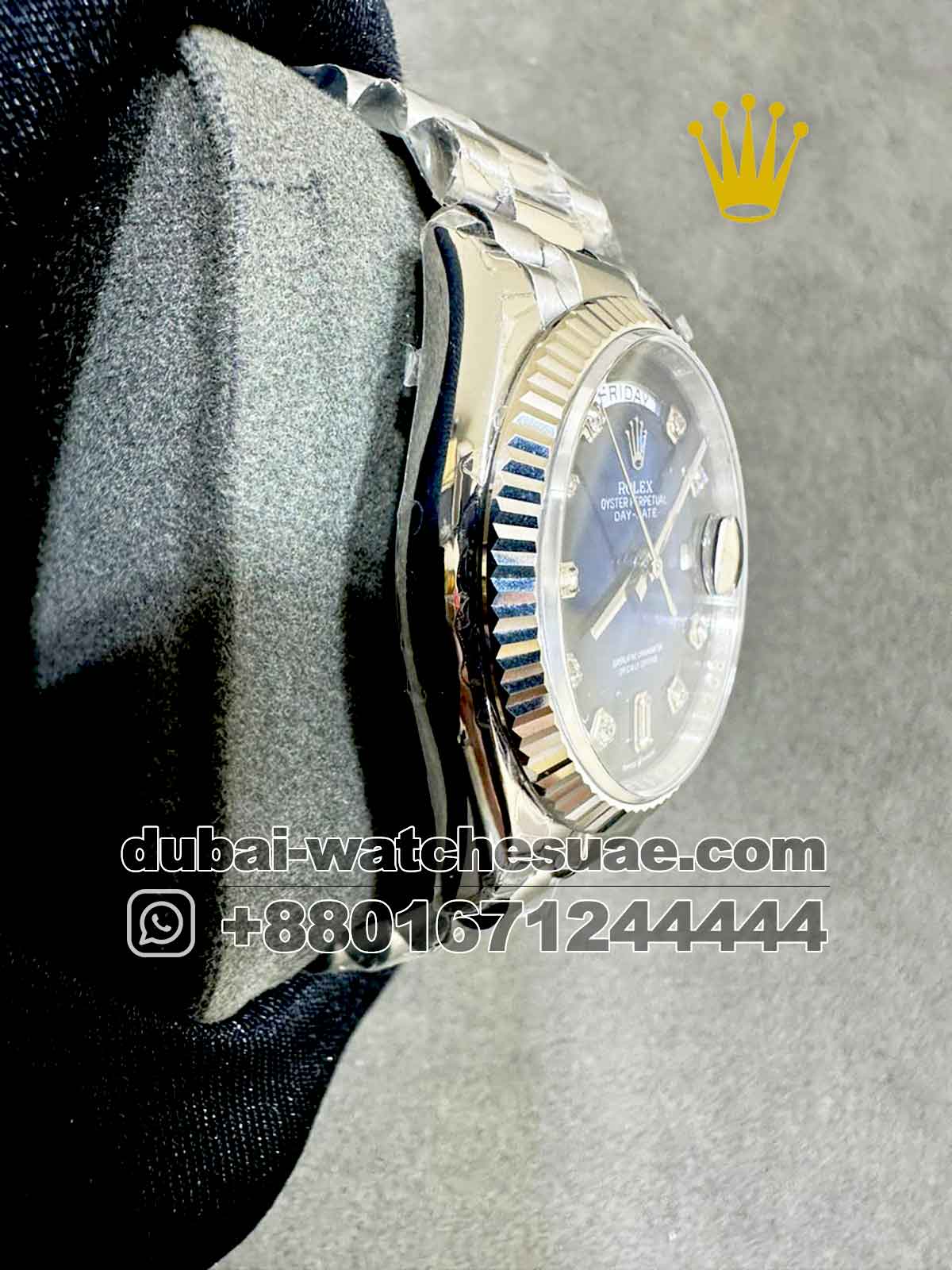 The fluted bezel is one of the most recognisable creative aspects found in premium timepieces inspired by Rolex. In this 36mm Day-Date replica, the fluted bezel elevates the overall design, giving it a bold and polished personality. The bezel is made of premium 904L stainless steel, which not only increases durability but also gives on a bright, polished brilliance that catches light from all directions. The carefully crafted slots in the fluted pattern produce a dynamic visual effect. As the wrist moves, the bezel reflects light, giving the watch more depth and character. This copy watch stands out in both professional and informal contexts because to its shimmering look, which exudes elegance and refinement. It beautifully frames the blue dial, highlighting the stoned numbers while preserving a well-balanced appearance. This unique fluted bezel not only raises the watch’s aesthetic appeal but also represents status, self-assurance, and timeless luxury.