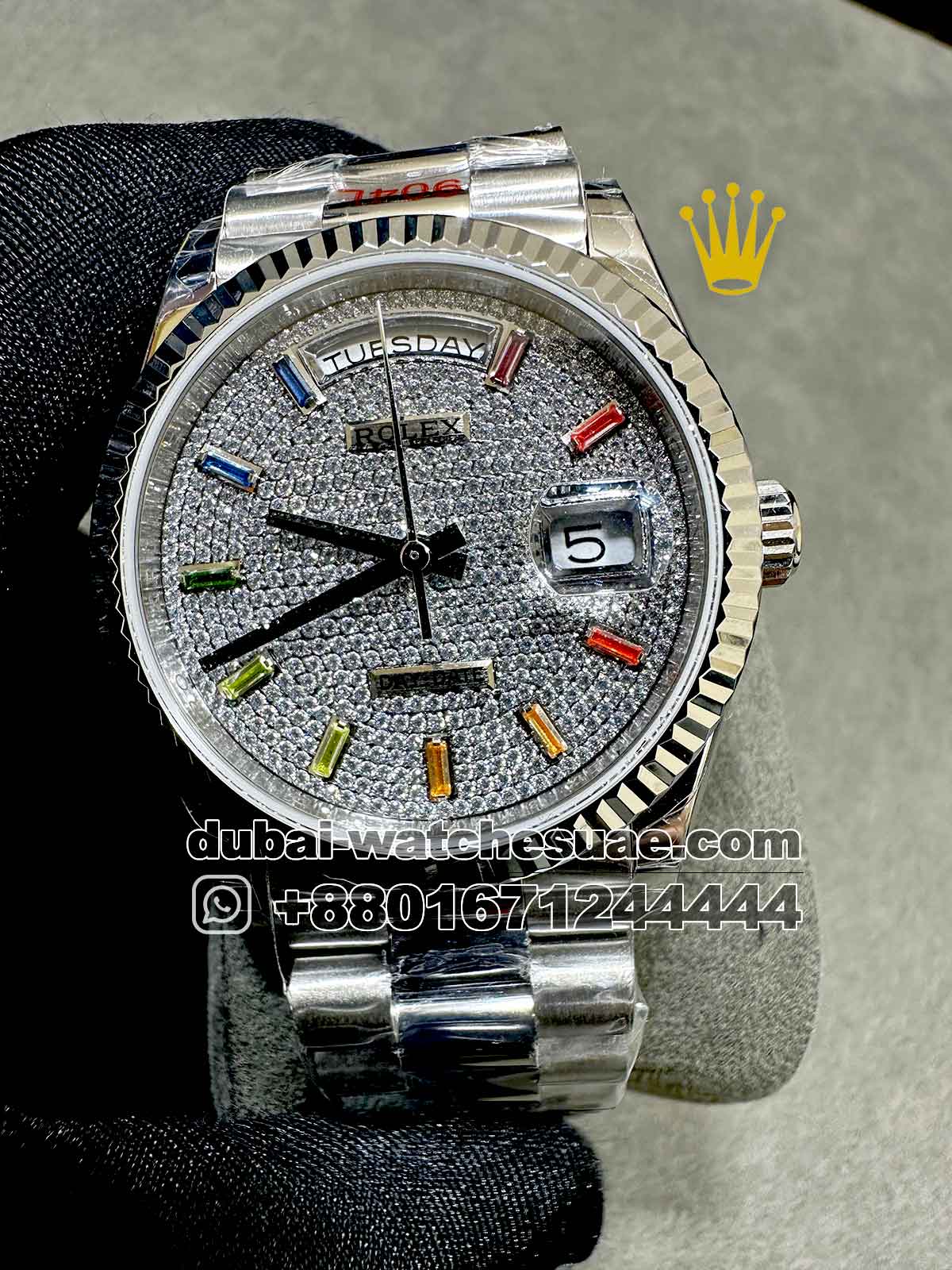 Rolex 36 mm? Silver Day? Date Stoned Dial With Rainbow Stoned Numeric Flutted Bezel With President Bracelet Copy