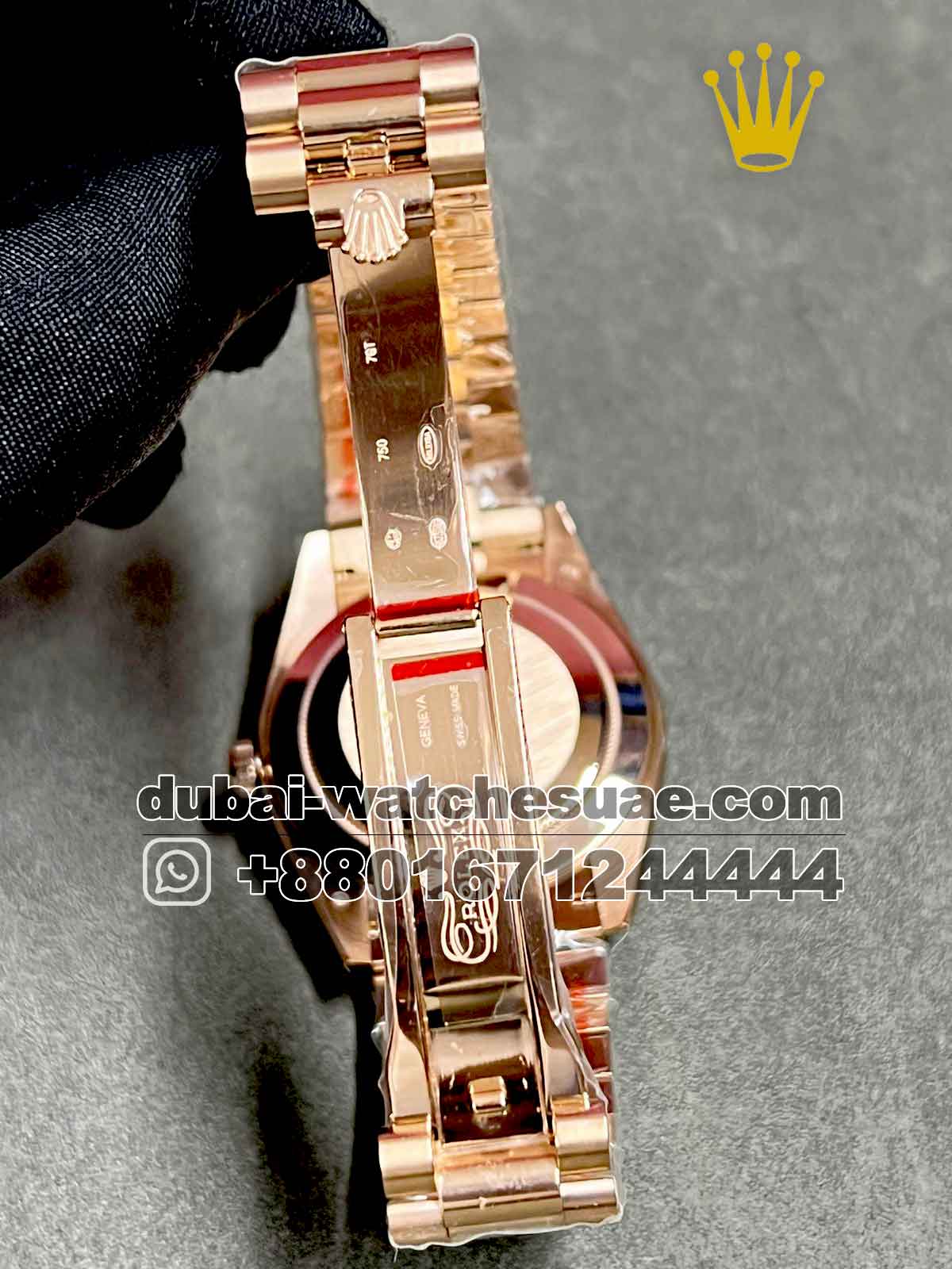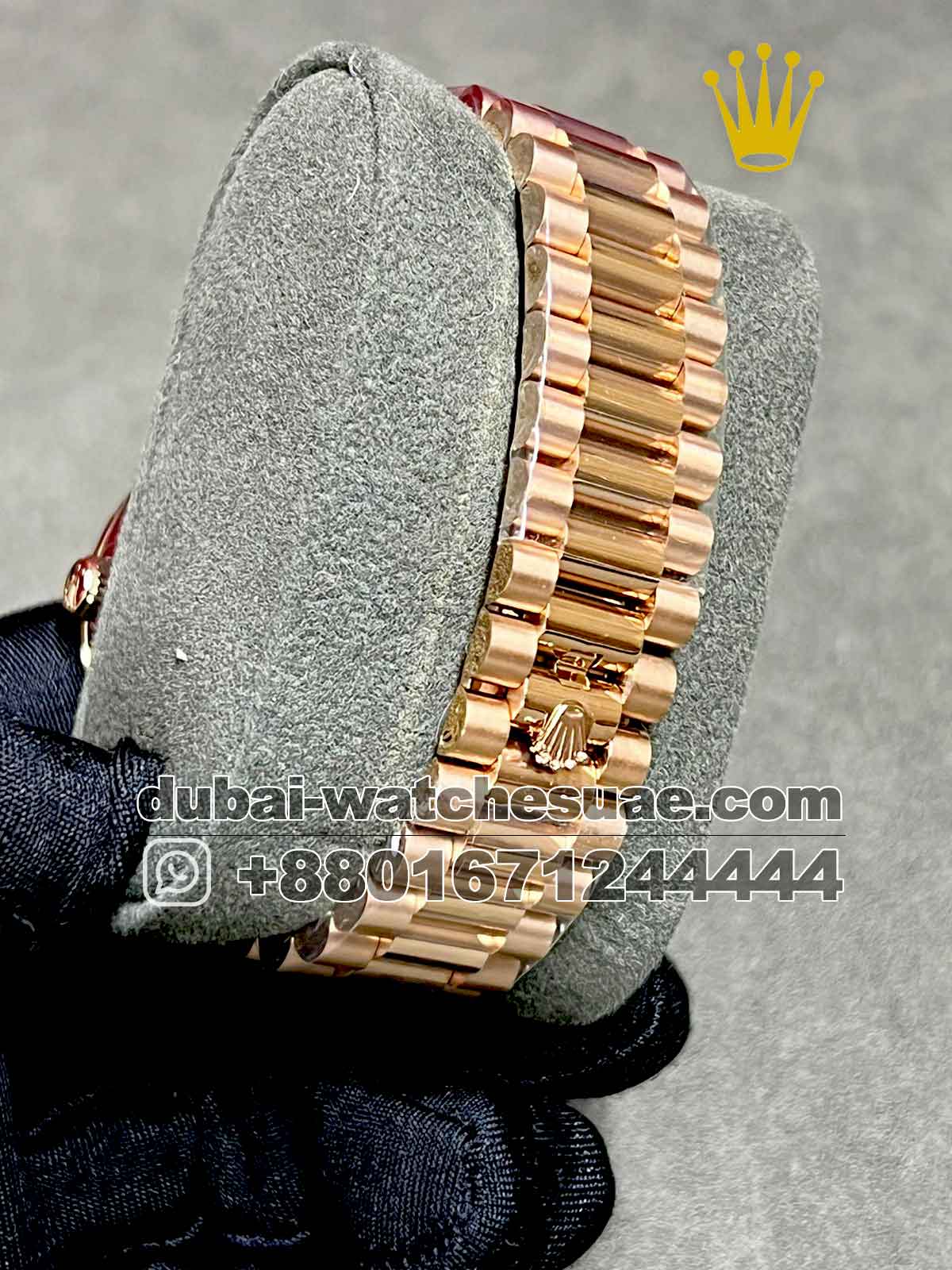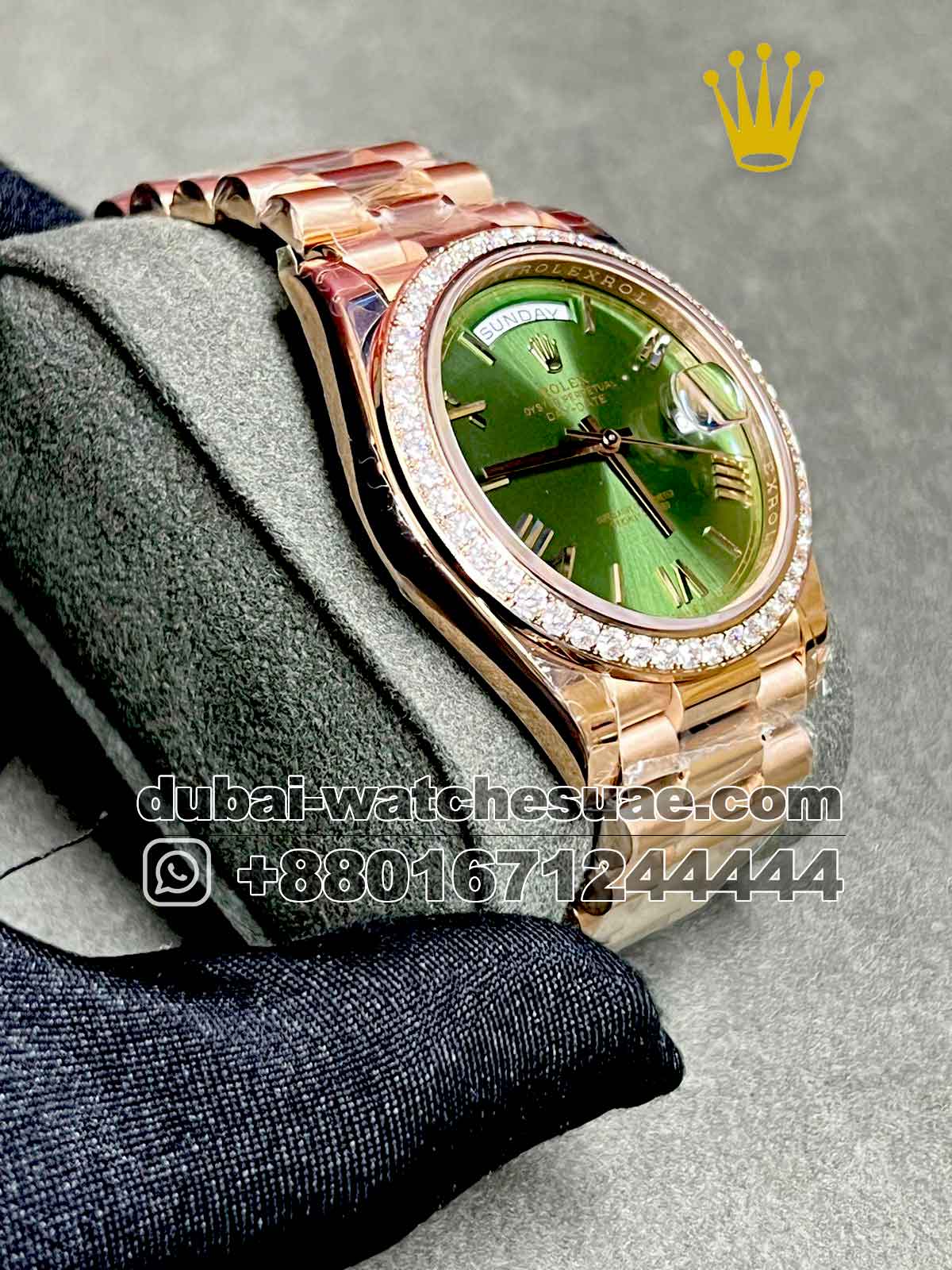 Model: Rolex 40 mm Day date ,Rose gold, green dialStoned