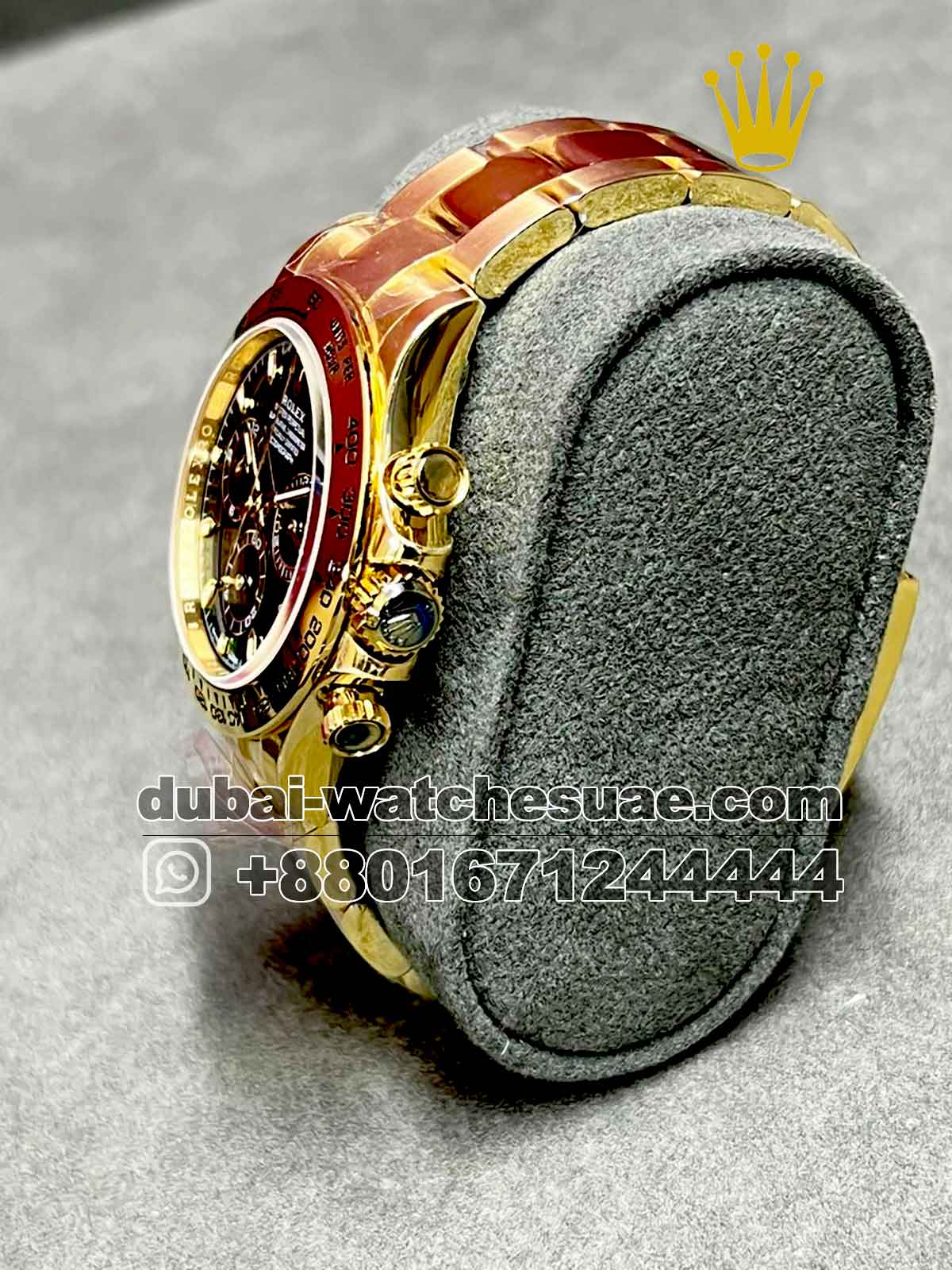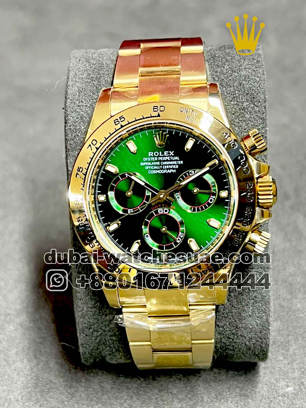 These replica timepieces in authentic quality are hard to come by. These watches are offered by Dubai Watches UAE at reasonable costs. Our all products are of the super clone grade. You may buy from us with confidence. So feel free to contact us now if you like Rolex Cosmograph Daytona Yellow Gold Green 116508. Your vanity will increase with this watch.
