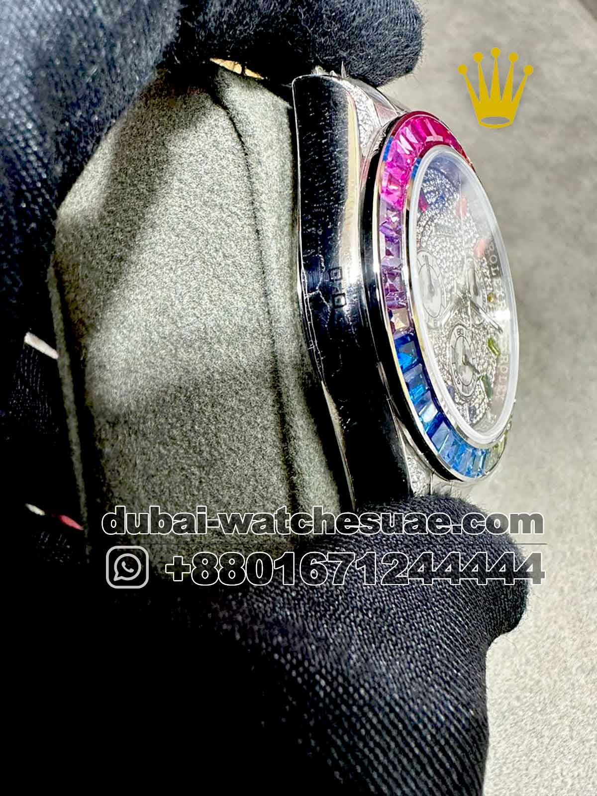 The Rolex Daytona Ice Out is a unique piece of the Rolex family. Each stone is like a single snowflake and together makes a piece of ice holding your wrist. Its dial is the most attractive place. It is fully white stonework and the sub-dials are also white. Every stone shines like a diamond and gives you a soothing feeling. Its rounded rainbow bezel reflects the full stone dial. Overall, it gives you a decent, elegant appearance. Different colored stones are used for hour markers. The white sub dials for 12-hour and 30-minute are registered, as well as continuous seconds are spun by three engines. It also has minutes and one-fifth of a second on the outside. The bracelet is made of stainless steel with stone work in the middle line of three-piece links. It is waterproof to a depth of 100 meters (330 ft).